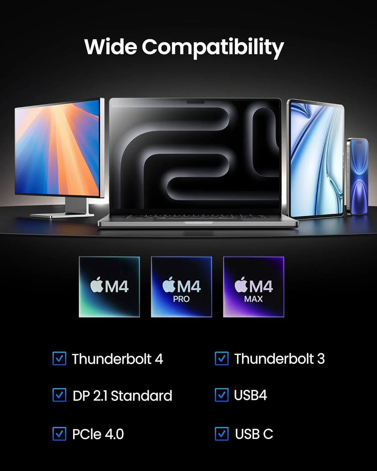 Pripojte takmer čokoľvek bez akýchkoľvek problémov. Kábel je kompatibilný s najnovšími štandardmi USB4, USB-C, DisplayPort 2.1 a PCIe 4.0, čo vám dáva flexibilitu pri jeho používaní s externými diskami, displejmi, grafickými dokmi a ďalšími zariadeniami.