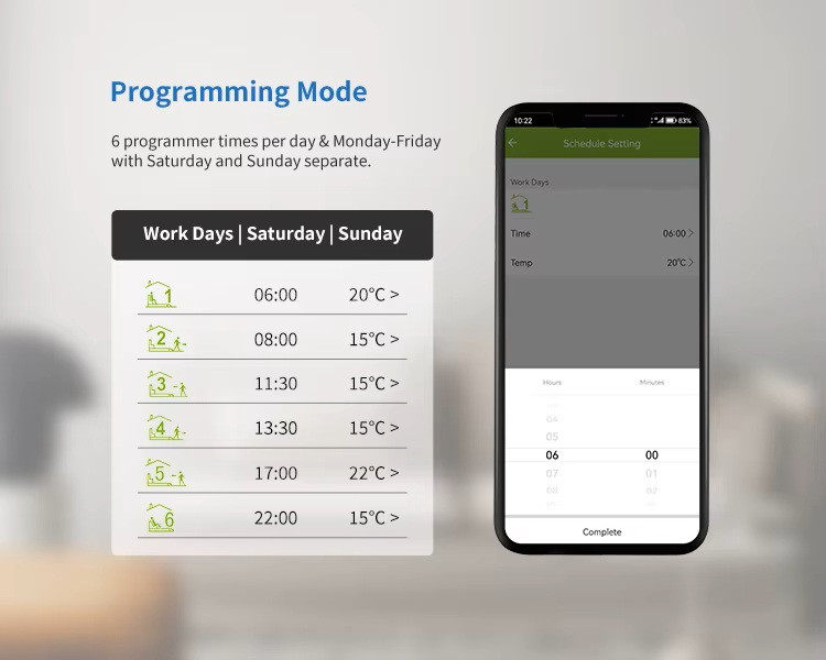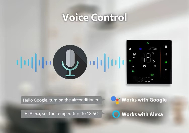 LCD dotykový displej Inteligentný termostat má elegantný, citlivý LCD dotykový displej, bez škrabancov a ľahko sa čistí. Dá sa ovládať z aplikácie Či už ste doma alebo na cestách, môžete na diaľku ovládať vykurovanie domácnosti pomocou aplikácie BlitzWolf / Smart Life alebo TuyaSmart z telefónu alebo tabletu na báze IOS a Android. Funguje len s 2,4 GHz Wi-Fi sieťami. Na fungovanie nepotrebuje rozbočovač. Hlasové ovládanie Termostat dokonale spolupracuje s Amazon Alexa a Google Assistant. Jednoducho dávajte hlasové príkazy na zapnutie/vypnutie alebo nastavenie správnej teploty, keď ste na cestách. Režim programovania 7-dňový programovateľný režim, ktorý je možné nastaviť na 5+2, 6+1 a 7 dní, aby vyhovoval všetkým vašim potrebám. Úspora energie S týmto inteligentným termostatom môžete ročne ušetriť približne 20 % nákladov na vykurovanie. Detský zámok Zabráňte náhodnému dotyku detí, vyhnete sa tak zbytočným stratám. Funkcia zdieľania Všetky zariadenia série Tuya môžete zdieľať so svojimi rodinnými príslušníkmi, aby ste mohli spoločne spravovať svoj domov.